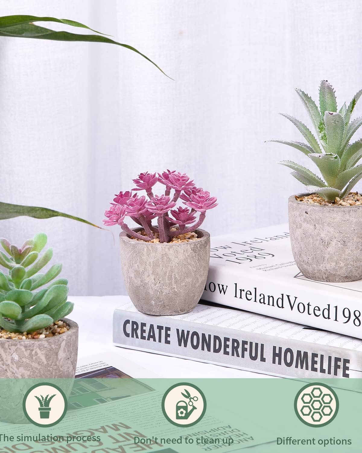 DECORACIÓN ELEGANTE Las plantas artificiales son adecuadas para todos los hogares y en todas partes Ideal para plantas artificiales en oficinas, dormitorios, salas de estar, cocinas, jardines, alféizares, balcones, etc. Dale un poco de vida a tu vida con esta elegante y realista planta artificial para exteriores ECOLÓGICA Y SEGURA Hicimos plantas simuladas de plástico de alta calidad y las macetas de pulpa reciclada. Estas plantas no necesitan ser regadas ni cuidadas. Pueden hacer que nuestras plantas de baño artificiales duren mucho tiempo sin pudrirse ni dañarse. Siempre permanecen brillantes y hermosas. Juego extenso Este juego contiene 8 plantas simuladas. plantas en macetas en miniatura Cada una de las 8 plantas consta de diferentes suculentas Tienen diferentes estilos y rico contenido GRAN REGALO Estas plantas en macetas realistas pueden agregar vida verde a su espacio vital Ya sea un cumpleaños, inauguración de una casa, evento de boda, evento de reunión de empresa o Navidad También puede regalar Es un regalo para amigos, profesores, colegas, amantes y familiares.